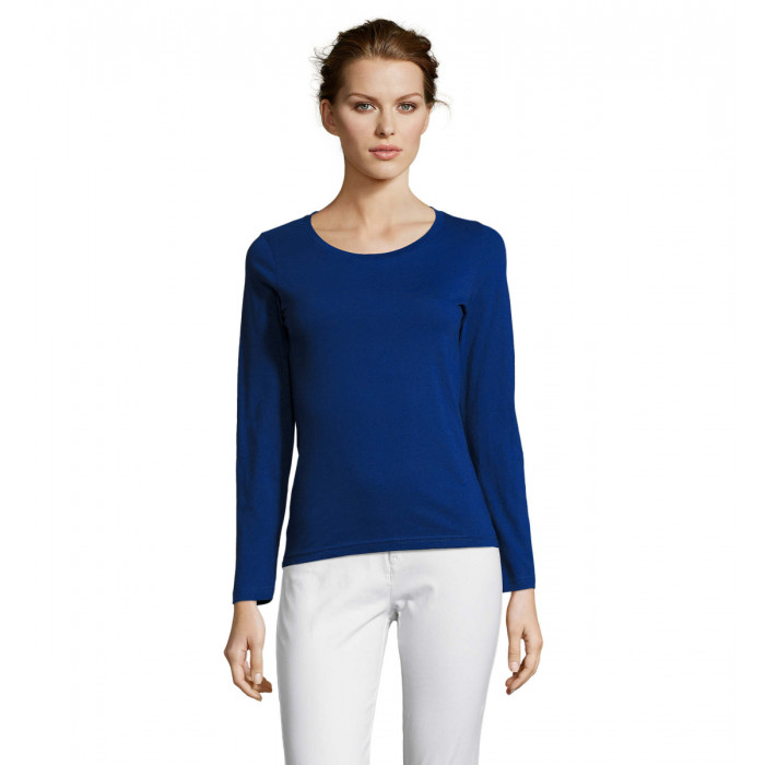 Футболка женская с круглым воротом и длинным рукавом SOL’S MAJESTIC. Стиль: классический, глубокий вырез -приталенная модель, манжеты без резинки; изделие выкроено из трикотажного полотна. Материал: ДЖЕРСИ 150. Полугребенной 100% хлопок, укрепляющая тесьма по вороту, край круглого ворота связан резинкой с эластаном. Вариант для мужчин: MONARCH-11420
