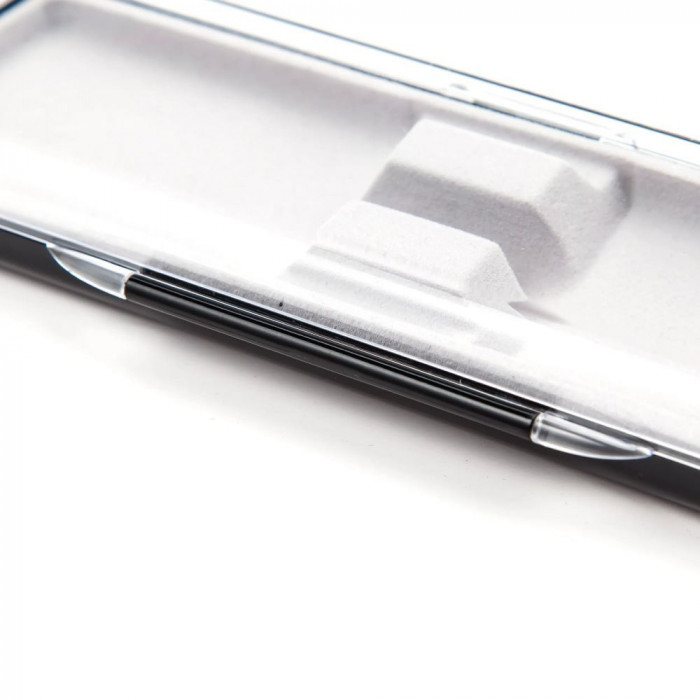 Футляр оборудован деталями, фиксирующими ручку в одном положении. Состоит из прозрачной крышки и черного основания. Изготовлен из безвредного пластика.