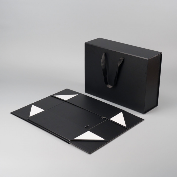 Коробка складна з твердого, переплетеного картону, з двома ручками, вкрита дизайнерським папером. Кришка на магнітах