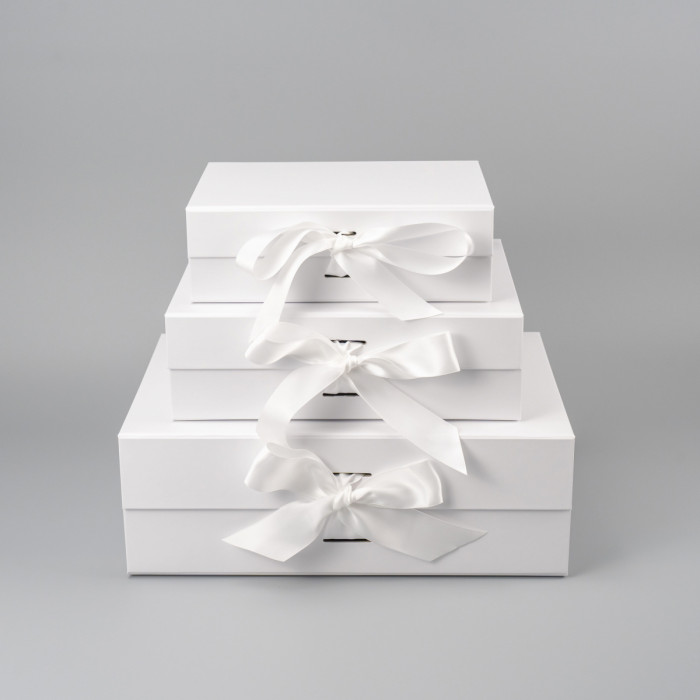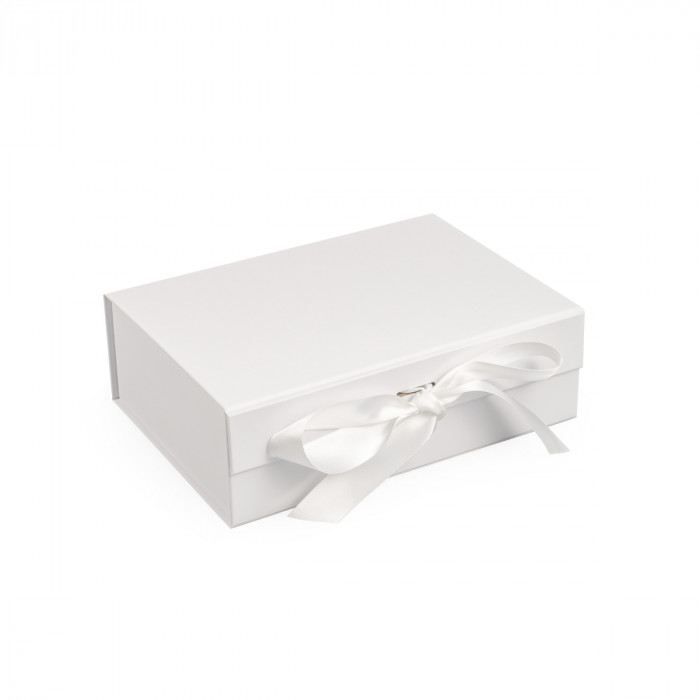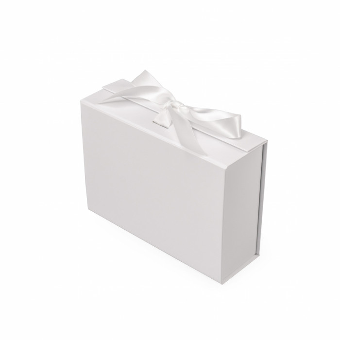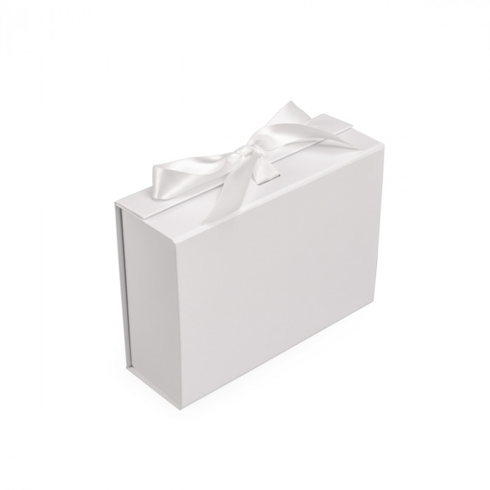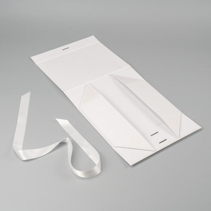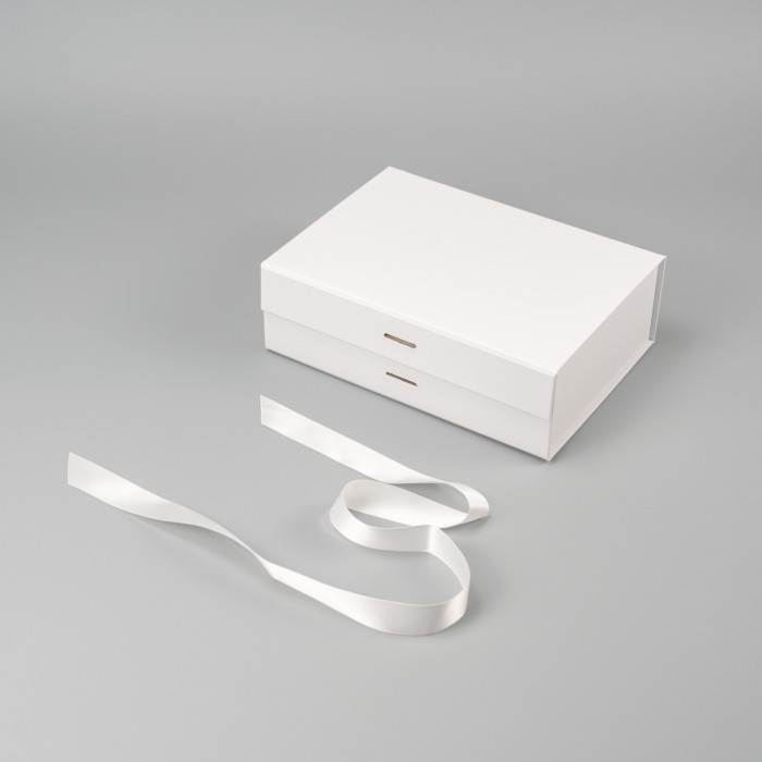 Коробка складна з твердого, переплетеного картону, вкрита дизайнерським папером, атласна лента ширина 3,5 см. Кришка на магнітах.