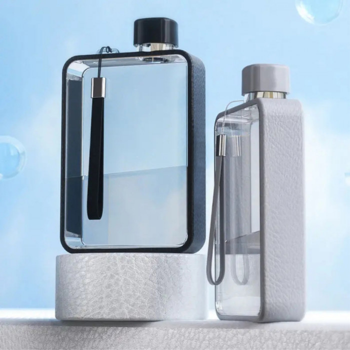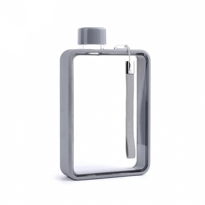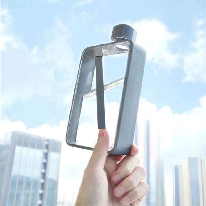 Пляшка виготовлена в мінімалістичному стилі, але її дизайн досить незвичний. Це справжній артоб’єкт з прозорими стінками й кольоровим контуром, що має м’яку текстуру. Для зручного транспортування пляшка обладнана пластиковим ремінцем.