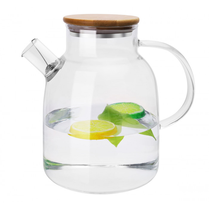 Чайник заварювальний виготовлений із високоякісного, термостійкого, боросилікатного скла, кришка виготовлена з бамбука, нержавіючої сталі та силікону,в горловині встановлена з'ємна спіраль, яка не дає виливатись в чашку заварку або фрукти. Об'єм 1800 мл., запакований в картонну подарункову коробку та пупирчастий пакет для кращого зберігання при транспортуванні. Метод нанесення гравіювання на бамбукову кришку,деколь на скляну колбу