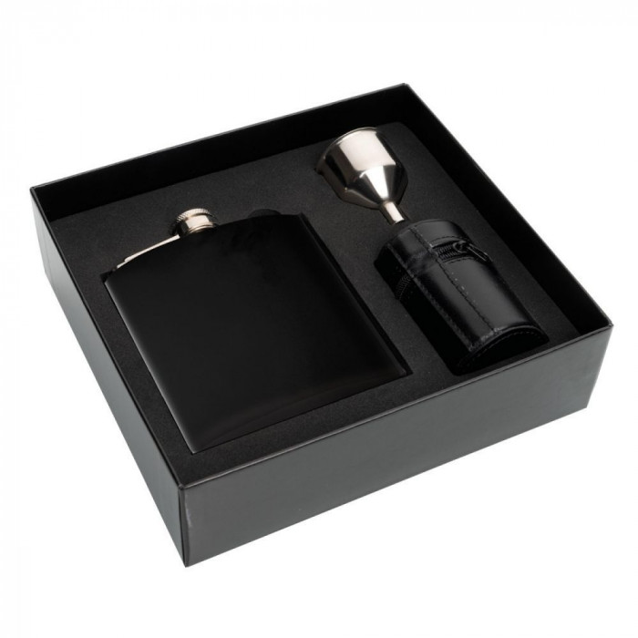 Набір фляга і стаканчики Schwarzwolf. Включає: чорну колбу з нержавіючої сталі, 4 чашки в чорному мішечку, воронку. Упаковано в подарункову коробку Schwarzwolf Outdoor.