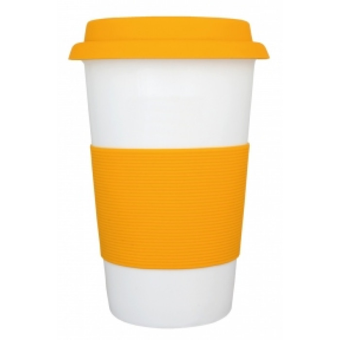 Керамическая чашка CREMA с яркой цветной силиконовой накладкой и крышкой. Благодаря крышке напиток долго остается теплым и не разбрызгивается при ходьбе или при езде в автомобиле. Силиконовая накладка предназначена для комфорта - чашка не скользит в руке и не позволяет обжечь руку от горячего напитка.