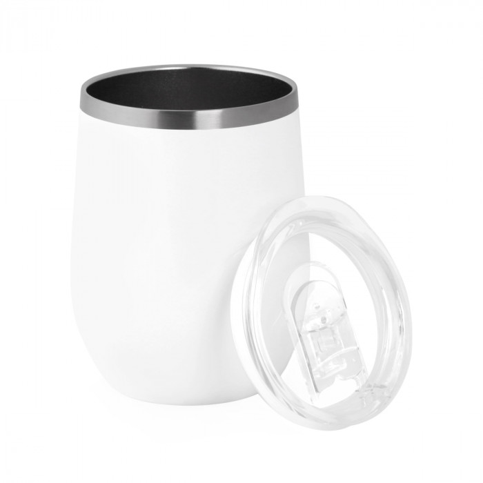 Металева термочашка з подвійними стійками з нержавіючої сталі ( глянцеве покриття емаль) і пластиковою прозорою кришкою з отвором. Кришку можна мити в посудомийній машині. Корпус мити тільки вручну, щоб не пошкодити кольорове покриття. Підтримує температуру протягом 6-ти годин