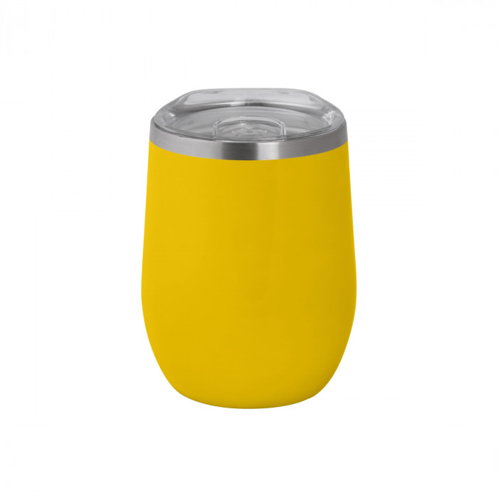 Металева термочашка з подвійними стійками з нержавіючої сталі ( глянцеве покриття емаль) і пластиковою прозорою кришкою з отвором. Кришку можна мити в посудомийній машині. Корпус мити тільки вручну, щоб не пошкодити кольорове покриття. Підтримує температуру протягом 6-ти годин