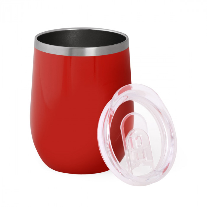 Металева термочашка з подвійними стійками з нержавіючої сталі ( глянцеве покриття емаль) і пластиковою прозорою кришкою з отвором. Кришку можна мити в посудомийній машині. Корпус мити тільки вручну, щоб не пошкодити кольорове покриття. Підтримує температуру протягом 6-ти годин