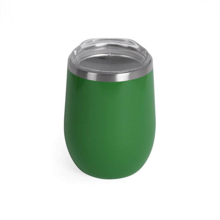 Металева термочашка з подвійними стійками з нержавіючої сталі ( глянцеве покриття емаль) і пластиковою прозорою кришкою з отвором. Кришку можна мити в посудомийній машині. Корпус мити тільки вручну, щоб не пошкодити кольорове покриття. Підтримує температуру протягом 6-ти годин