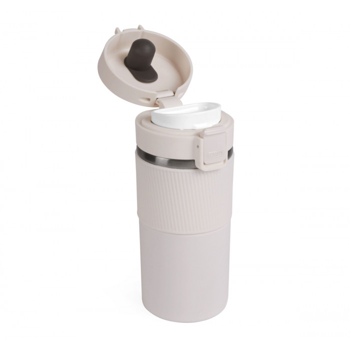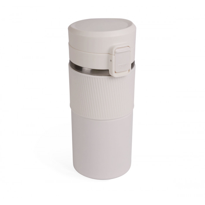 Вакуумна термокружка з нержавіючої сталі, обєм 370 мл. ,вкрита матовою кольоровою емаллю, кришка-непроливайка з ситечком, яка при необхідності блокується від випадкового відкривання. Підтримує температуру до шести годин. Упакована в індивідуальну чорну коробку та поліетиленовий пакет. Висота 18,6 см., діаметр 7 см