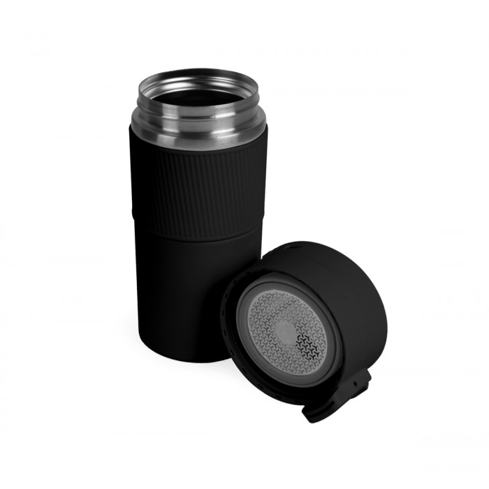 Вакуумна термокружка з нержавіючої сталі, обєм 370 мл. ,вкрита матовою кольоровою емаллю, кришка-непроливайка з ситечком, яка при необхідності блокується від випадкового відкривання. Підтримує температуру до шести годин. Упакована в індивідуальну чорну коробку та поліетиленовий пакет. Висота 18,6 см., діаметр 7 см
