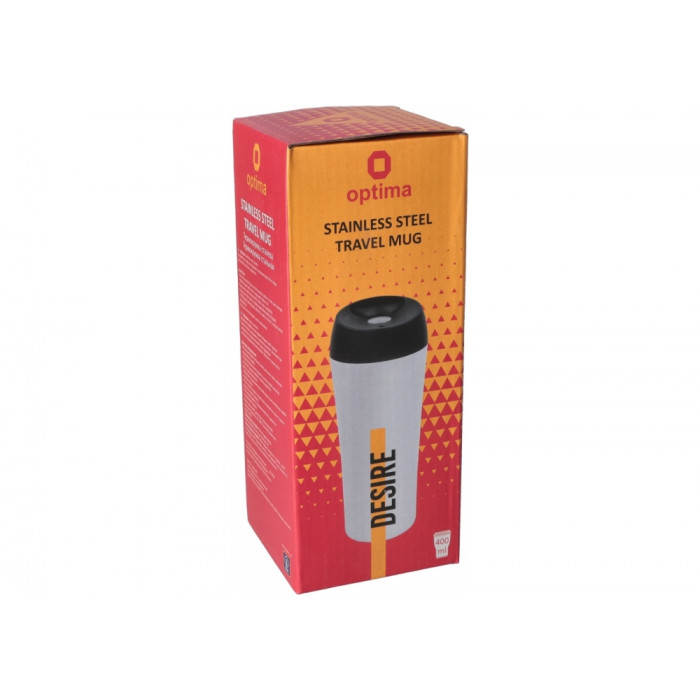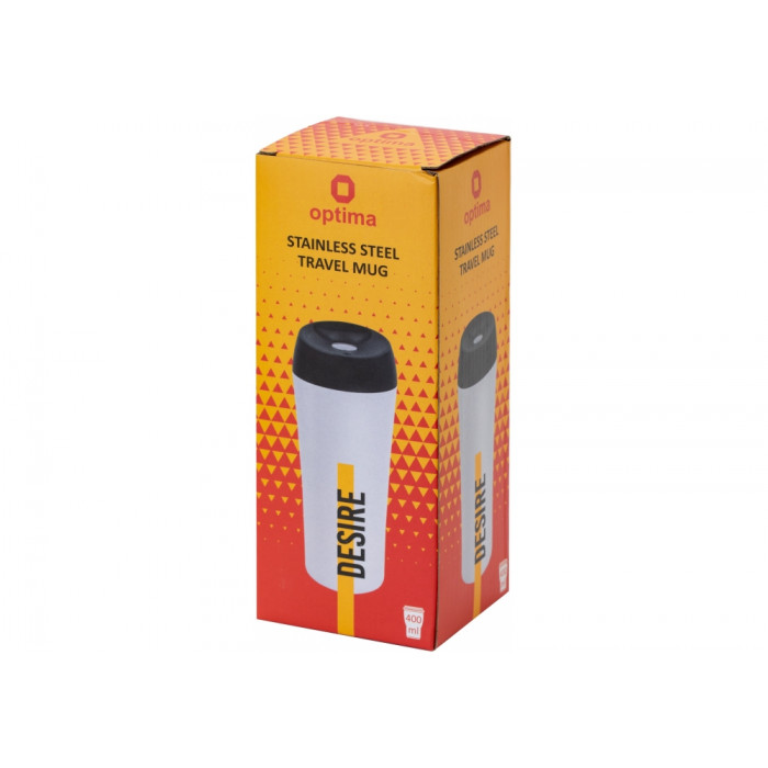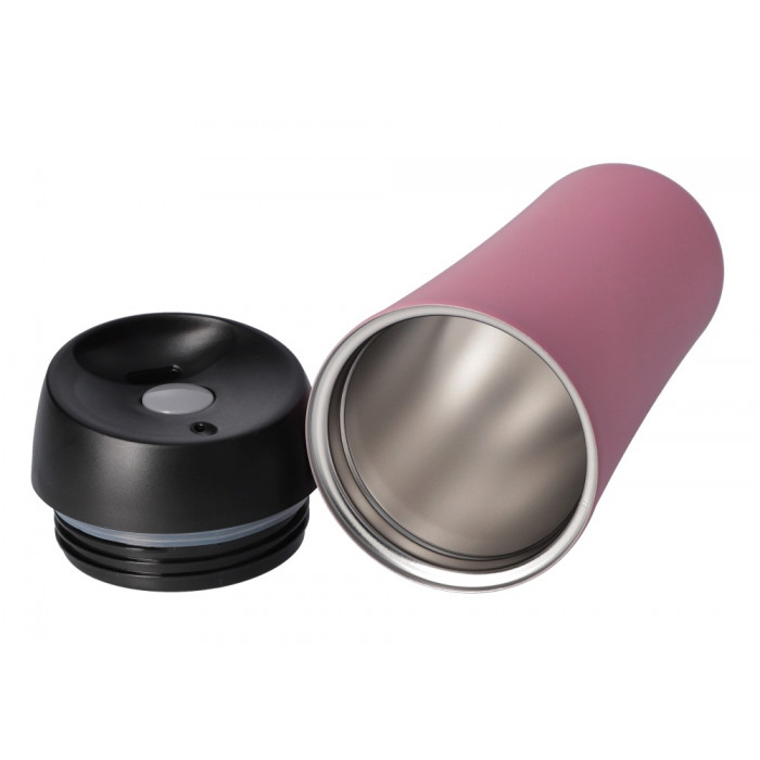 Класична термокружка; герметична кришка з кнопковим клапаном для пиття; однаково підходить як для гарячих так і холодних напоїв; подвійна високоякісна нержавіюча сталь; гумовий ущільнювач запобігає витіканню рідини та забезпечує тривале збереження температури напою; об'єм 400 мл; простота в очищенні та догляді.