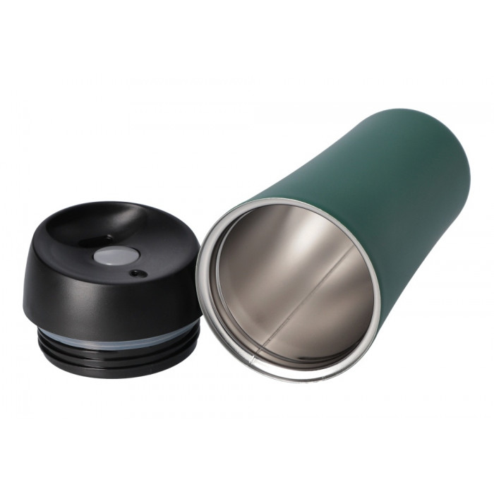 Класична термокружка; герметична кришка з кнопковим клапаном для пиття; однаково підходить як для гарячих так і холодних напоїв; подвійна високоякісна нержавіюча сталь; гумовий ущільнювач запобігає витіканню рідини та забезпечує тривале збереження температури напою; об'єм 400 мл; простота в очищенні та догляді.
