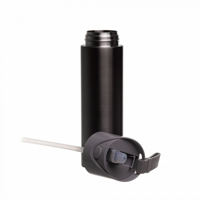 Об’єм пляшки – 550 мл. Тританова кришка обладнана кнопкою, яку потрібно натиснути, щоб напитися. Тритан – міцний матеріал, що ідеально витримує гарячі рідини.