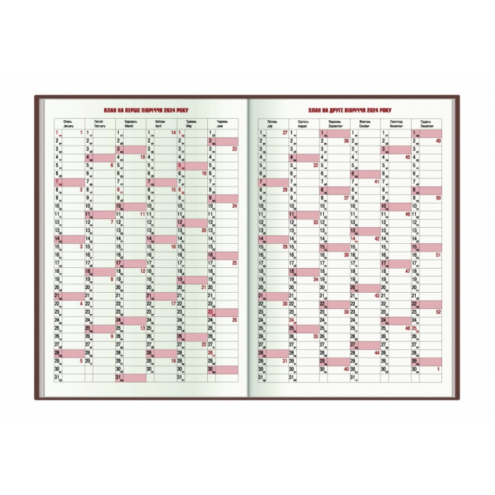 Одна сторінка – один робочий день, субота та неділя на одній сторінці, інформаційний блок – 4 сторінки, блок для нотаток в клітинку - 14 сторінок.