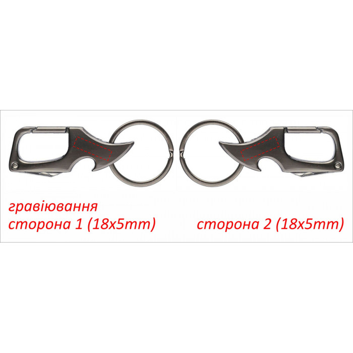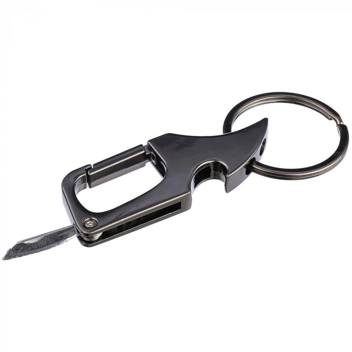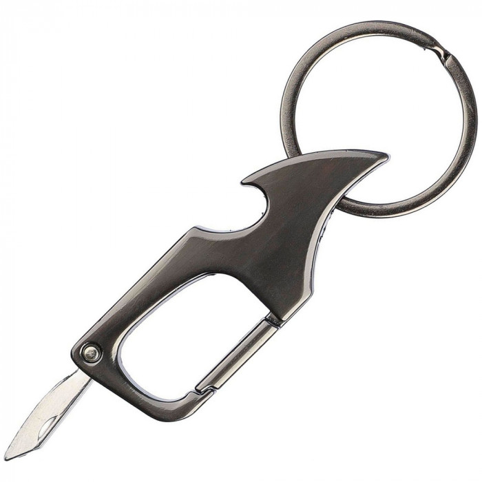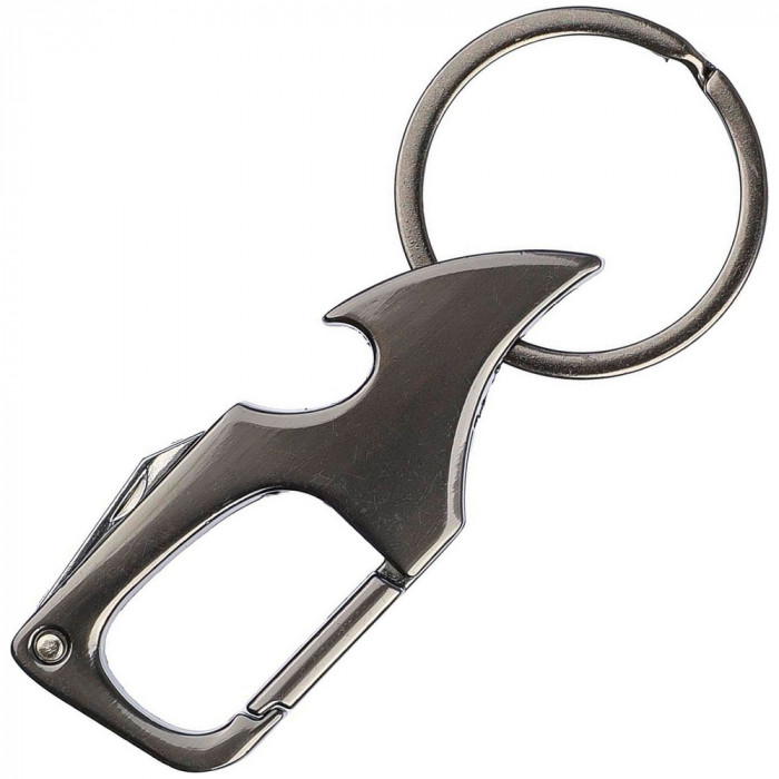 Металлический брелок-мультитул с кольцом для ключей. Совмещает в себе маленький нож, открывалку и карабин.