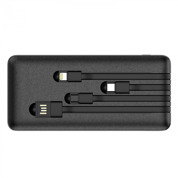 Універсальний зарядний пристрій, акумулятор: літій-полімерний, широка сумісність. Корпус пристрою вогнетривкий пластик.Має індикатор залишкового заряду. Вхід: DC 5V/2.1A (кабель Micro/USB) Вихід: DC 5V/2.1A (Micro/iPX/Type-C). Загальний вихід (USB + кабель): DC 5V/2.1A(Max)