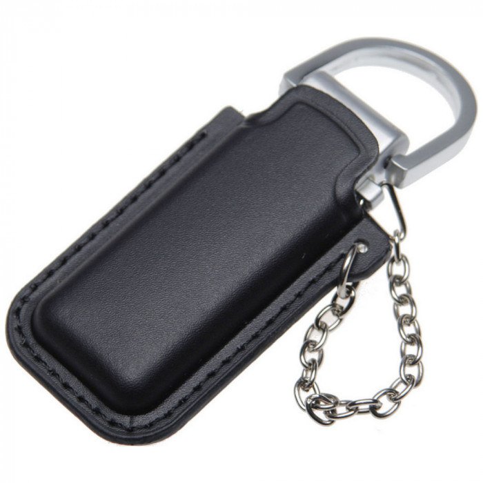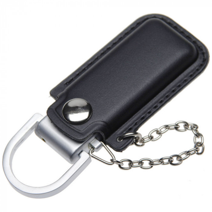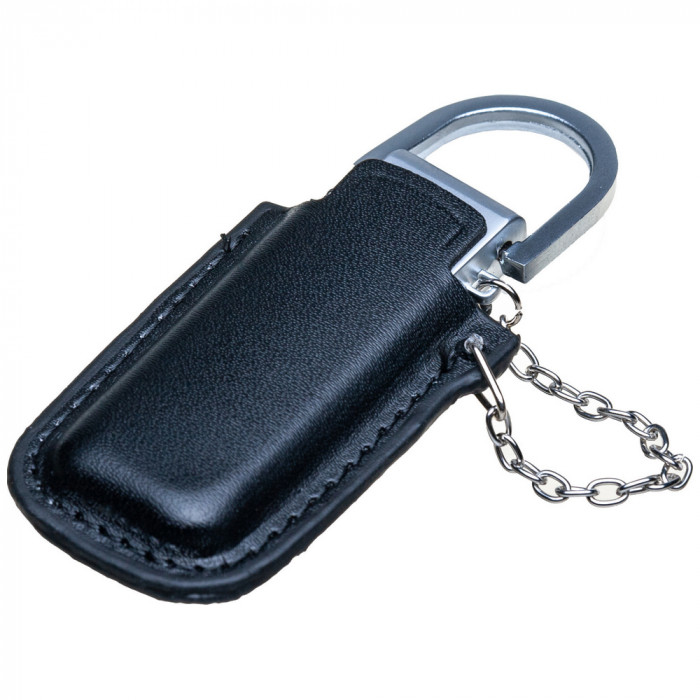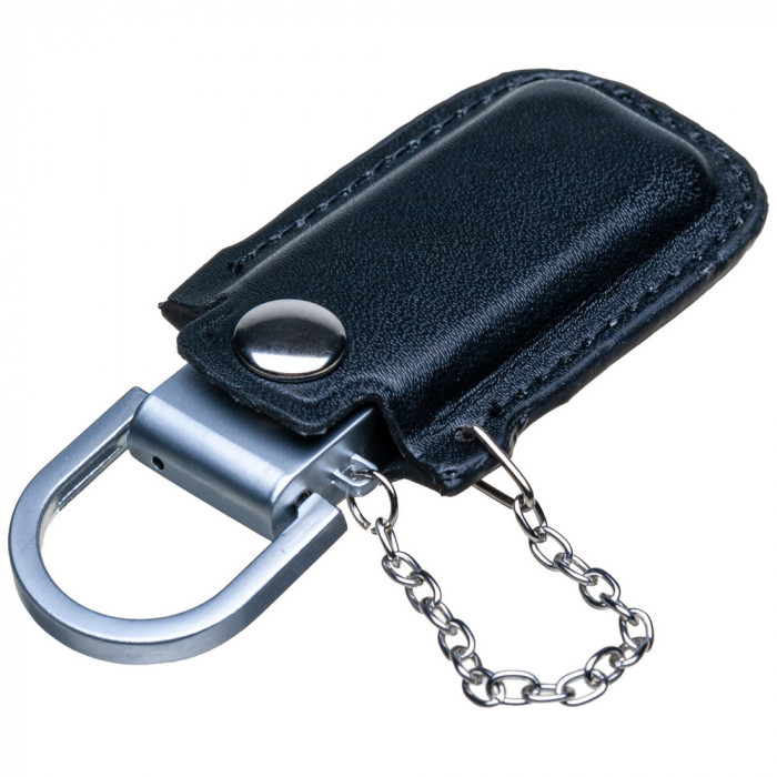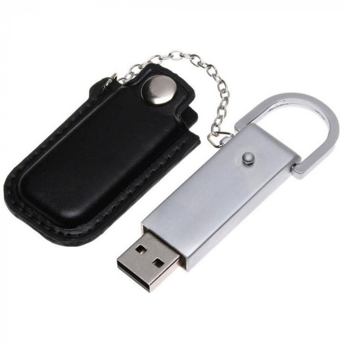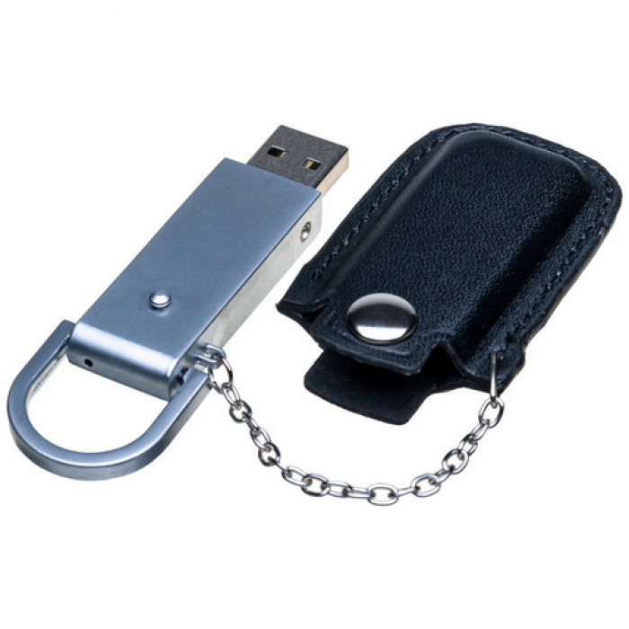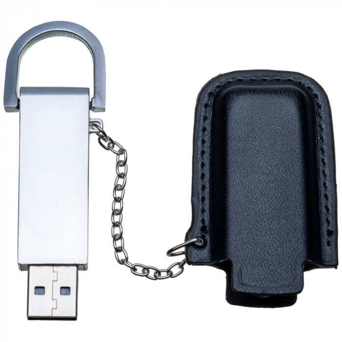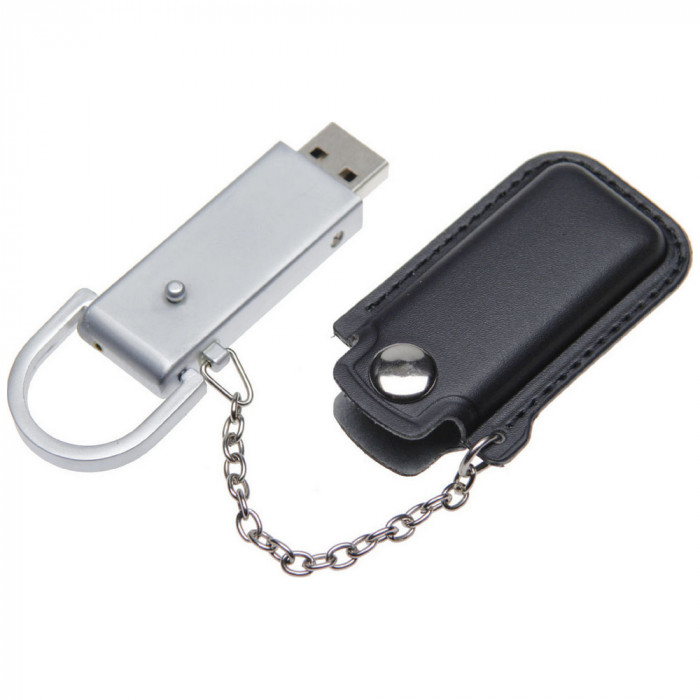 Флешка с чехлом из натуральной прессованной кожи. Матовый металлический корпус. Интерфейс USB 2.0. Чехол крепится к корпусу флешки на цепочку длиной 60 мм. Также имеется кольцо для крепления в качестве брелока. Размер металлической части флешки (без USB-разъема): 16 x 45 мм.