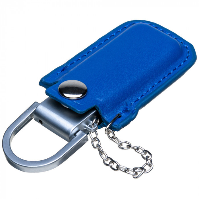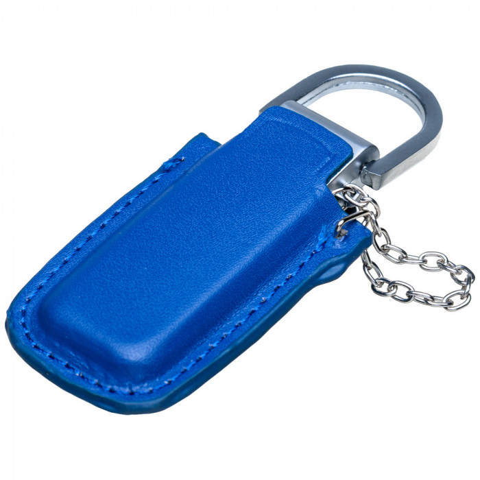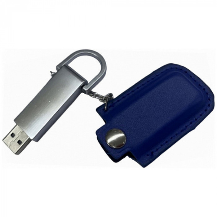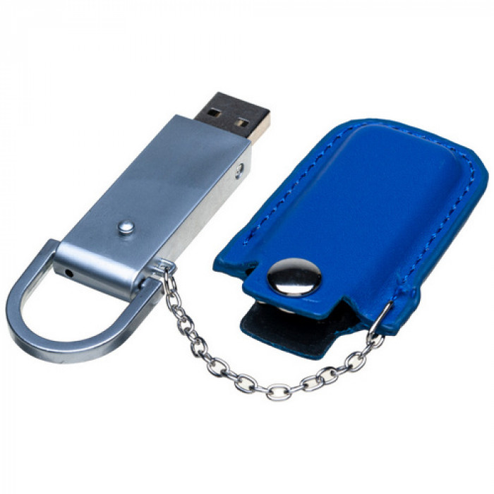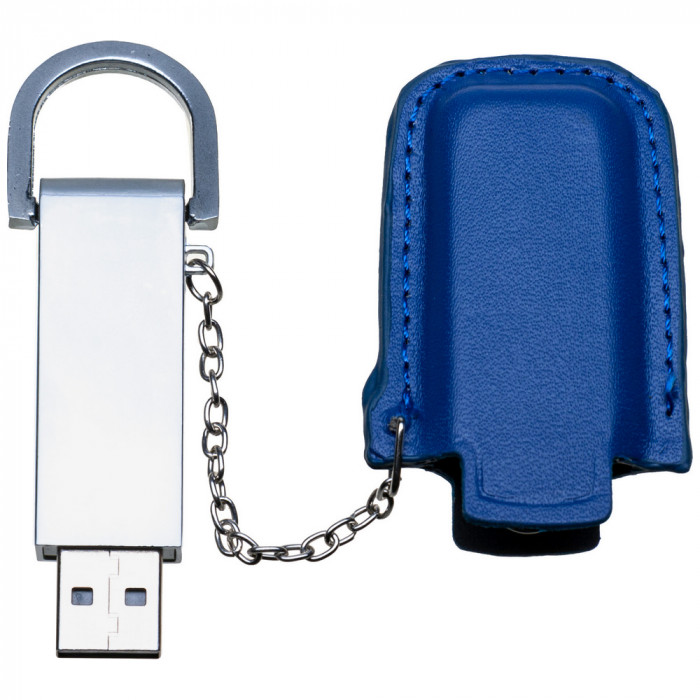 Флешка с чехлом из натуральной прессованной кожи. Матовый металлический корпус. Интерфейс USB 2.0. Чехол крепится к корпусу флешки на цепочку длиной 60 мм. Также имеется кольцо для крепления в качестве брелока. Размер металлической части флешки (без USB-разъема): 16 x 45 мм.