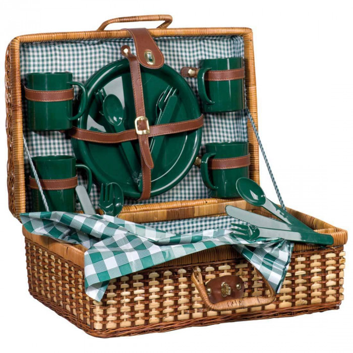 Корзина для пикника со столовым, пластиковым набором для четырёх человек. В состав входят тарелки, столовые приборы, кружки и скатерть. Идеален для отдыха за городом.