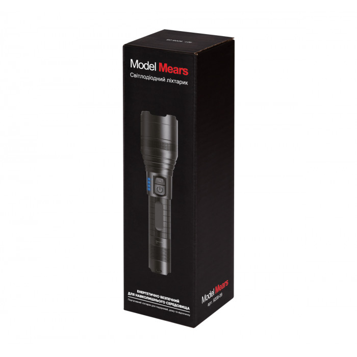 Светодиодный фонарик Mears энергетически безопасен для окружающей среды. Водостойкий и ударопрочный алюминиевый корпус. Прост в использовании, легкий и компактный. В комплекте ремешок на руку. Сверхяркий светодиод XHP50. Режимы: 5 (100%, 75%, 50%, страбоскоп, SOS). Аккумулятор: 1 х 18 650 2000 mAh. Индикатор питания аккумуляторной батареи. ПРЕДУПРЕЖДЕНИЕ: Не направляйте луч в глаза, так как это может привести к повреждению зрения. Берегите прибор подальше от детей. В случае длительного простоя аккумулятор следует извлечь и хранить в сухом и прохладном месте.