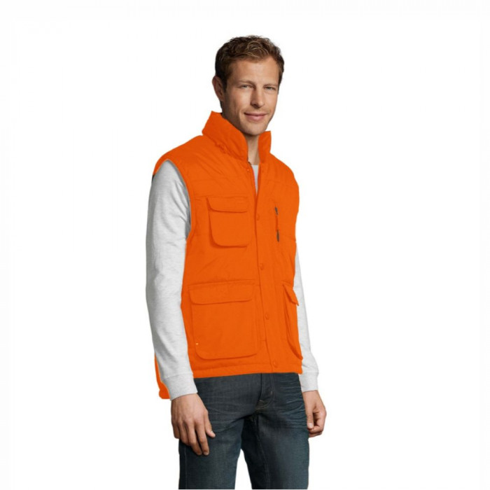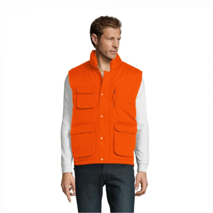 Жилет унисекс SOL’S VIPER. Стеганый воротник-стойка, множество карманов, отверстия для телефонной гарнитуры в кармане и на воротнике, суженная пройма рукавов для защиты от ветра, стягивающая резинка на талии. Материал: Микроволокно с пропиткой ПВХ, подкладка из полиэстера 190T, водонепроницаемая мягкая текстура.