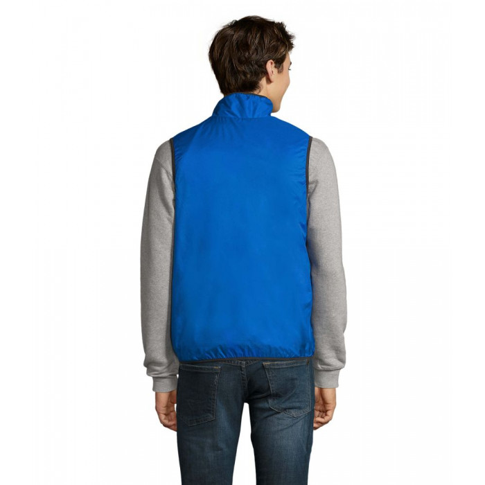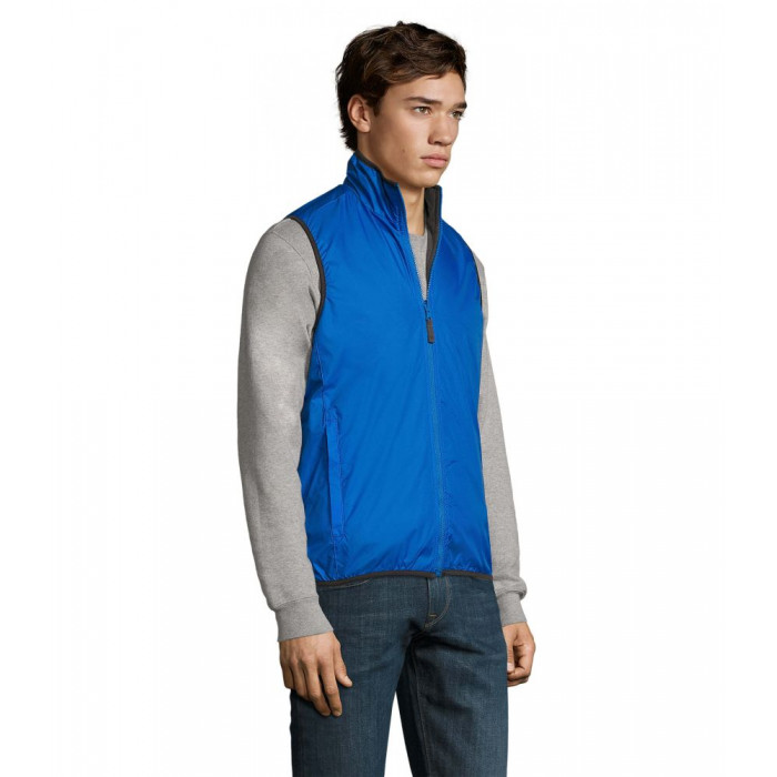 Жилет унисекс двусторонний. Лицевая сторона 100% нейлон, с водостойкой пропиткой - воротник и само изделие с контрастной подкладкой из флиса. Застёжка молния в тон, 2 кармана.