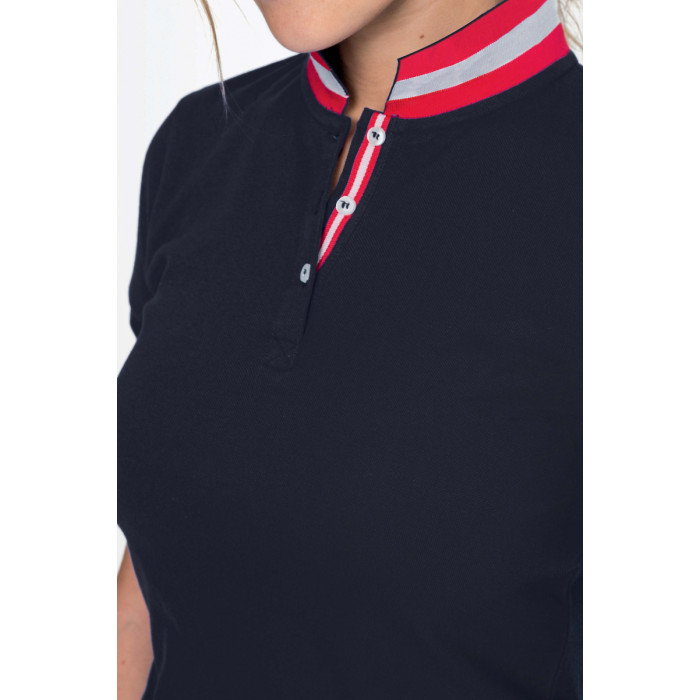 100% хлопок воротник и нижние края рукавов в резинку укрепляющая тесьма по воротуКороткие рукава Kонтрастная обратная сторона воротника Усиленная планка с 3 белыми перламутровыми пуговицами Тонкая контрастная полоска на внутренней тесьме по вороту и