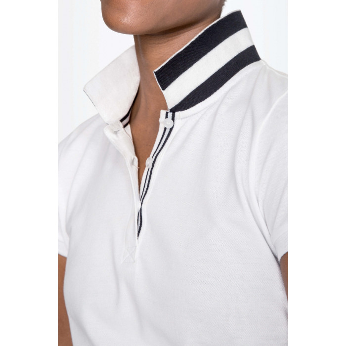 100% хлопок воротник и нижние края рукавов в резинку укрепляющая тесьма по воротуКороткие рукава Kонтрастная обратная сторона воротника Усиленная планка с 3 белыми перламутровыми пуговицами Тонкая контрастная полоска на внутренней тесьме по вороту и