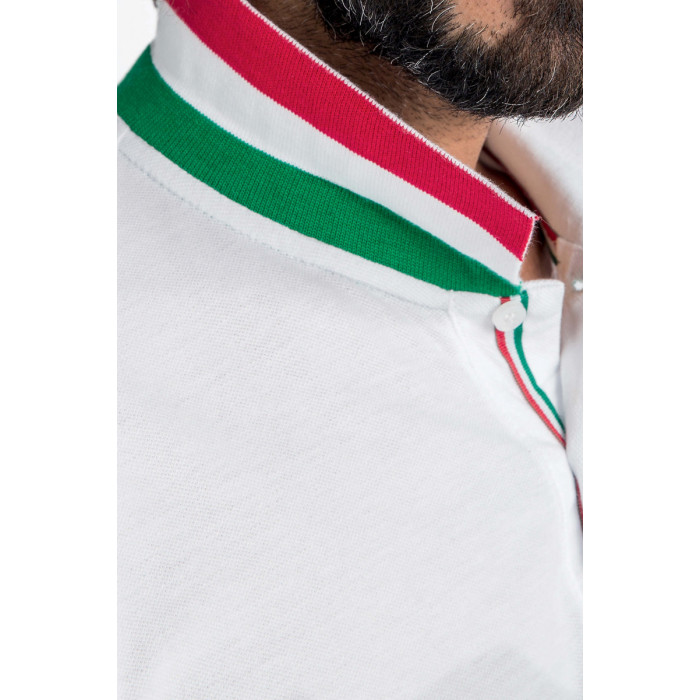 Короткие рукава. Kонтрастная обратная сторона воротника. Усиленная планка с 3 белыми перламутровыми пуговицами. Тонкая контрастная полоска на внутренней тесьме по вороту и на планке с пуговицами. Mаленькая декоративная двуцветная вставка на внешней сторо