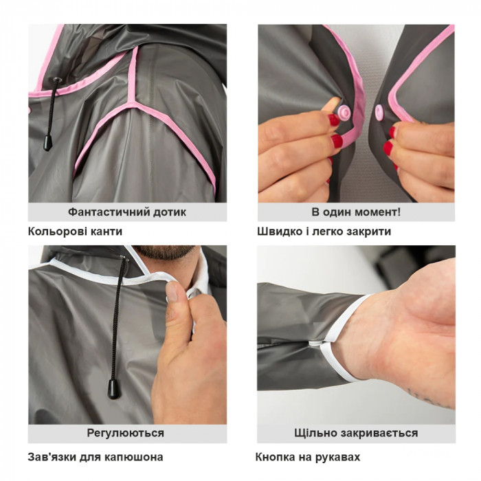 Водонепроникний напівпрозорий тренч Perletti має чорну окантовку. Це ідеальний одяг для прогулянок в дощову погоду, екскурсій в гори чи на природу. Під ним ви залишитесь сухим навіть під час зливи.
