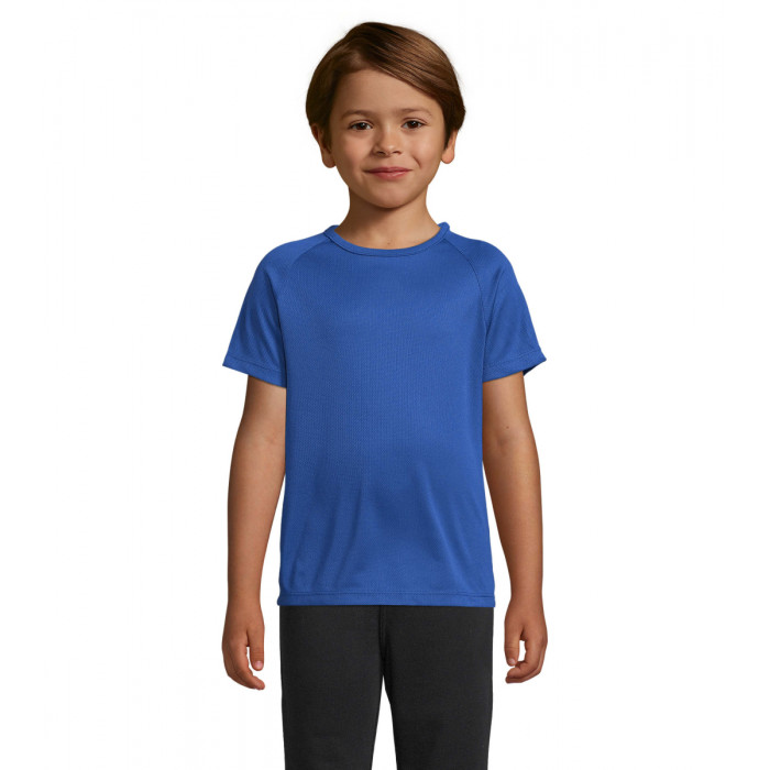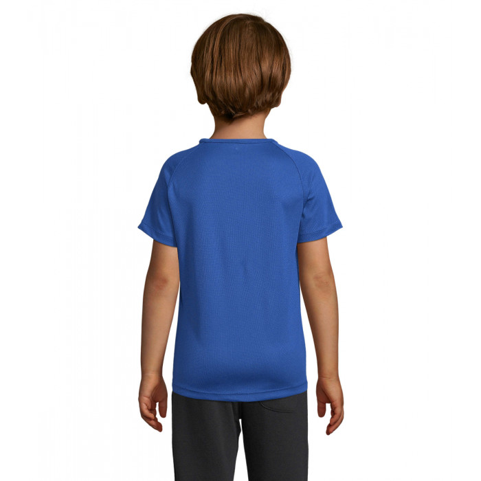 Детская футболка с коротким рукавом типа "реглан"; 100% воздухопроницаемый ("дышащий") полиэстер, подбитый воротник. Низ изделия и низ рукавов с двойным швом. Удлиненная спинка. Быстро сохнущая и комфортная ткань; для детей от 6 до 12 лет.