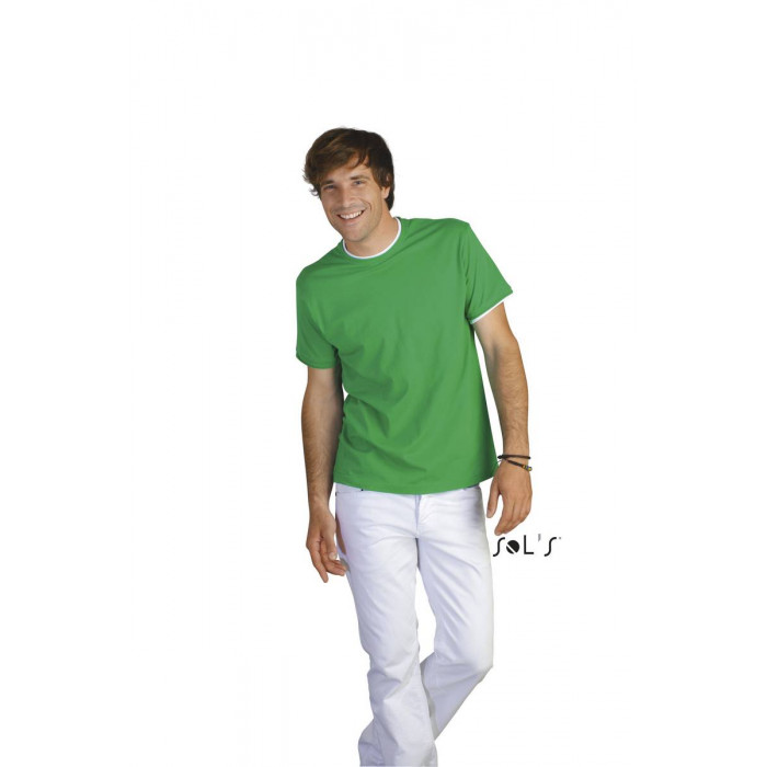 Футболка, с отделкой в виде закручивающихся неподрубленных краев. Полугребенной 100% хлопок,укрепляющая тесьма по вороту.