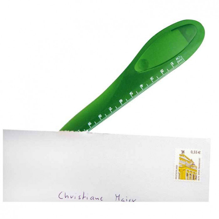 3 в 1! Линейка, нож для вскрытия конвертов и клип для карточек. Доступна в четырёх цветах: синий, красный, белый и зелёный. Печать нанесём на корпусе линейки.
