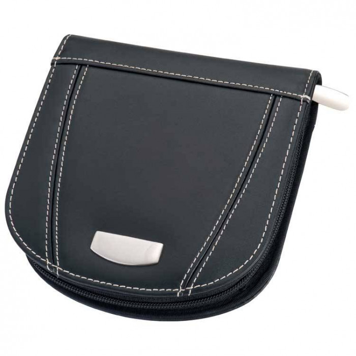 Футляр для 24-х CD-дисков, выполненный из чёрной кожи. Исключительным дополнением являются белые швы, придающие ему элегантность. Рекламный логотип предлагаем наносить на специально предназначеном для этого металлическом элементе на передней части.