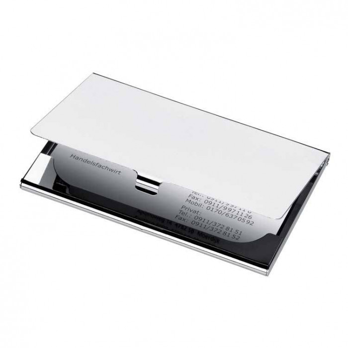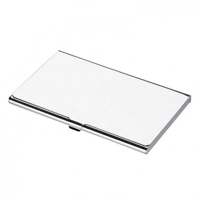 Футляр для визитных карточек, выполненный из зеркально-блестящего металла. Рекламный логотип нанесём в любом месте при помощи лазерной гравировки.