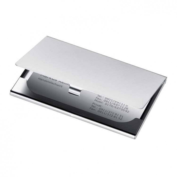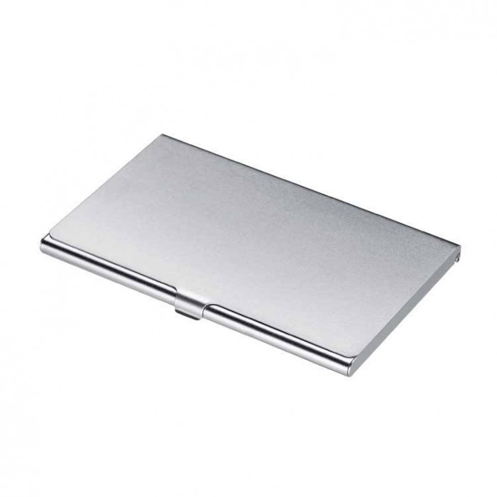 Футляр для визитных карточек, выполненный из матового металла. Рекламный логотип нанесём в любом месте при помощи лазерной гравировки.
