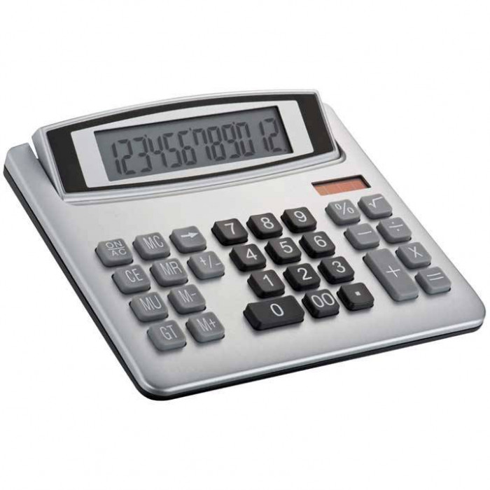 Офисный калькулятор из серебряного пластика с 8 цифровым, поднимающимся дисплеем и большими удобными кнопками. Идеальноe место для размещения лотипа - это повеpхность под дисплеем.