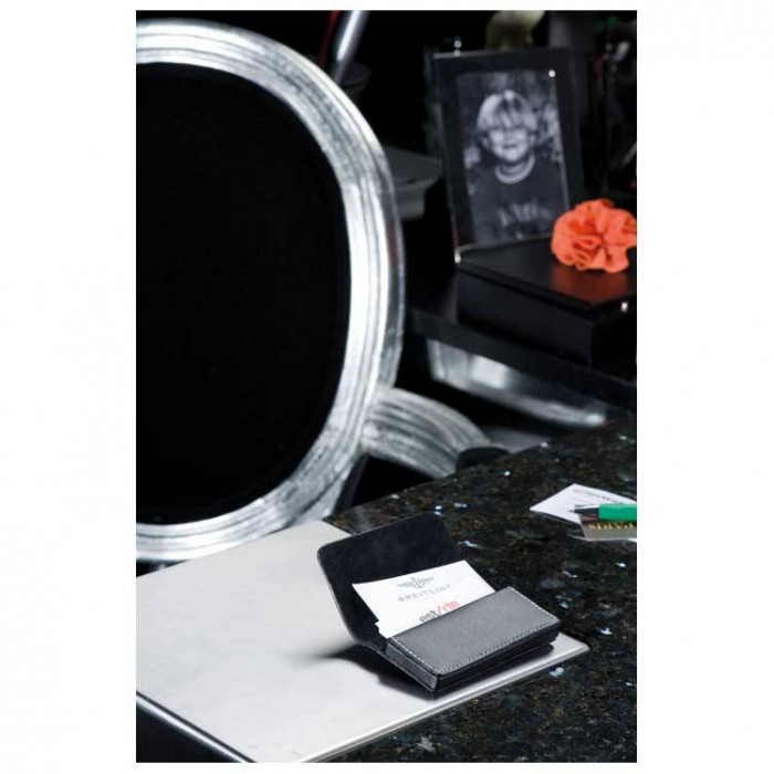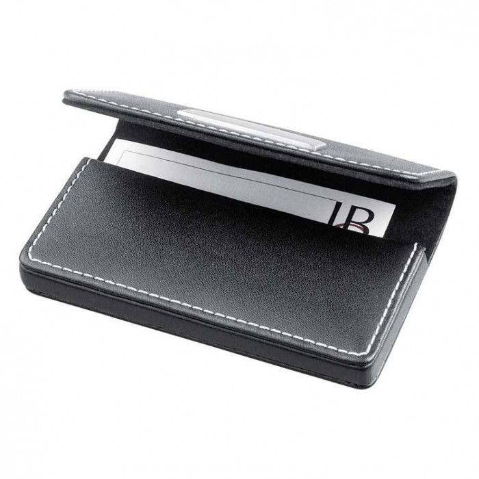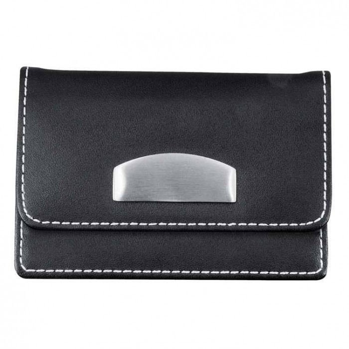 Кожаный футляр для визитных карточек с металлическим элементом на передней части, на котором можно выполнить гравировку Вашего рекламного логотипа. Визитница обшита белыми нитками, что придаёт ей элегантный вид.