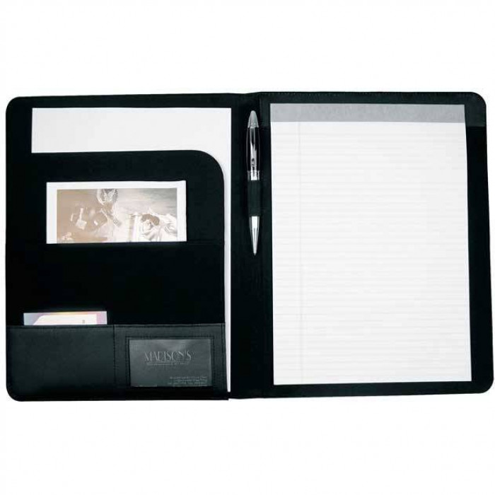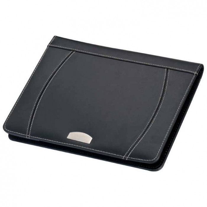 Папка А4, выполненная из чёрной кожи с блоком А4, и различными карманами. Исключительным дополнением являются белые швы, придающие ей элегантность. Рекламный логотип предлагаем наносить на специально предназначеном для этого металлическом элементе.