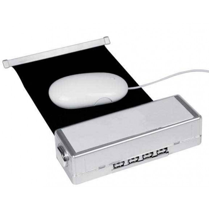 Стильный коврик для компьютерной мышки с самосворачивающимся механизмом, имеет четыре порта USB 2.0. Будет идеально смотреться на каждом письменном столе и окажется очень практичным в дороге.
