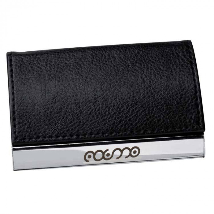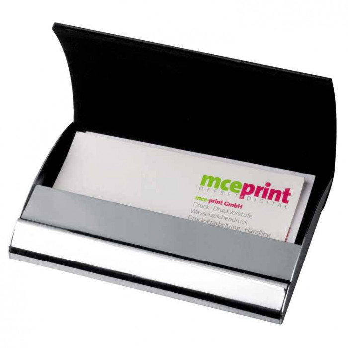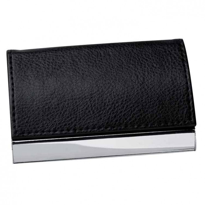 Высококачественная, металлическая визитница. Притягивает взгляд, благодаря хромированной части корпуса. Крышка покрыта кожезаменителем.