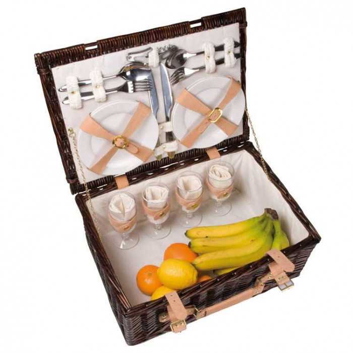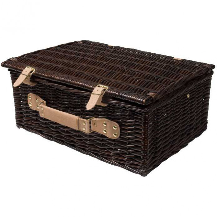 Плетёная, раскладывающаяся корзина для пикника с удобной ручкой. Имеет внутренний карман для охлаждения продуктов и столовый набор для двух человек. Доступна тёмно-коричневого цвета.