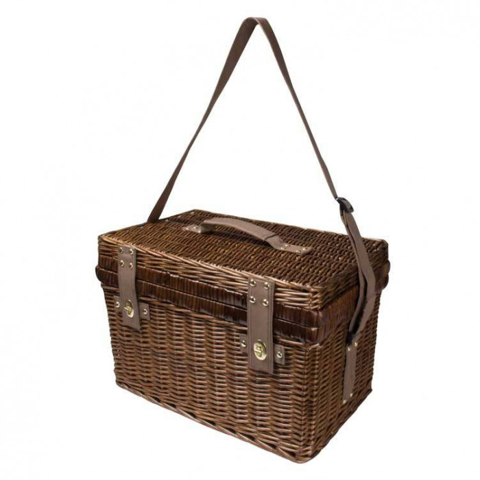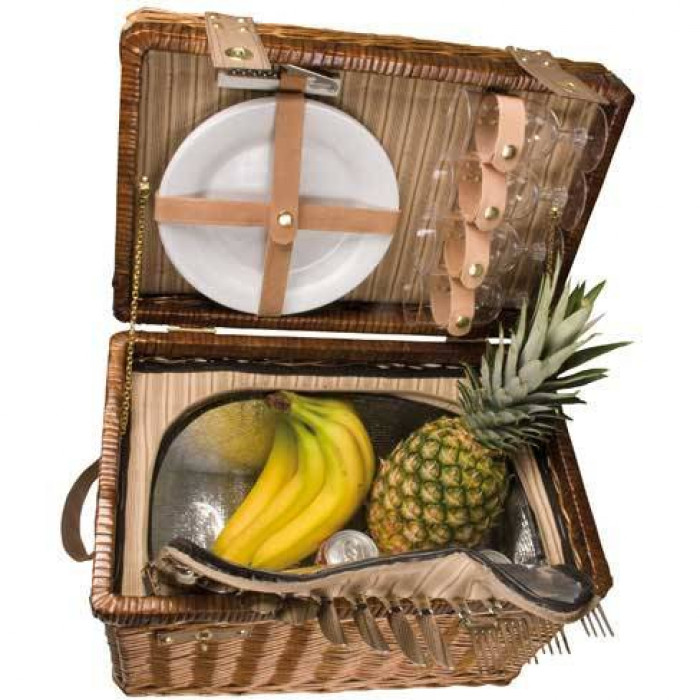 Плетёная корзина для пикника с набором столовых приборов для четырёх человек. Внутренний карман служит для охлаждения продуктов или напитков. В комплект входит также необходимый на отдыхе карманный ножик.