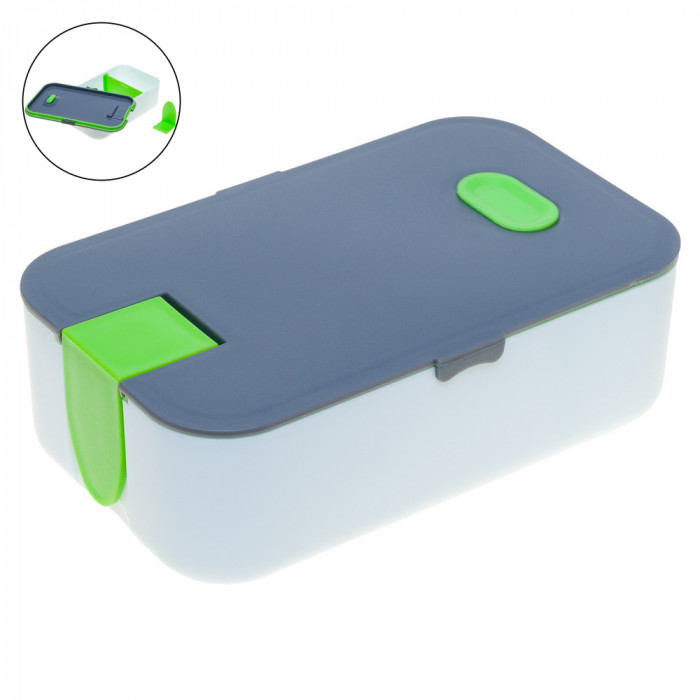 Ланч-бокс из полипропилена с силиконовым клапаном на крышке. Комплектуется передвижной перегородкой для отделения разных типов еды. Застежка на крышке служит подставкой телефона. В крышке имеется силиконовый клапан для использования в микроволновке.
