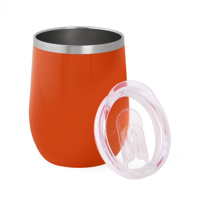 Металева термочашка з подвійними стійками з нержавіючої сталі ( глянцеве покриття емаль) і пластиковою прозорою кришкою з отвором. Кришку можна мити в посудомийній машині. Корпус мити тільки вручну, щоб не пошкодити кольорове покриття. Підтримує температуру протягом 6-ти годин