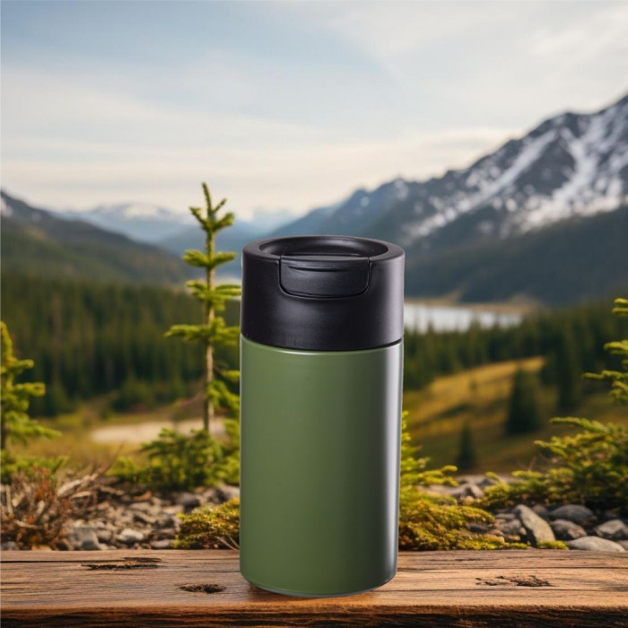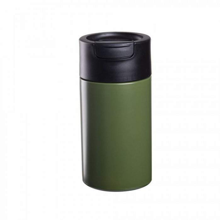 Объем 450 мл. Корпус изделия изготовлен из нержавеющей стали марок 304 (внутри) и 201 (снаружи). Крышка-дозатор без содержимого BPA. Рекомендуется мыть вручную. Матовое покрытие не является скользким, поэтому кружка не ускользает из рук.