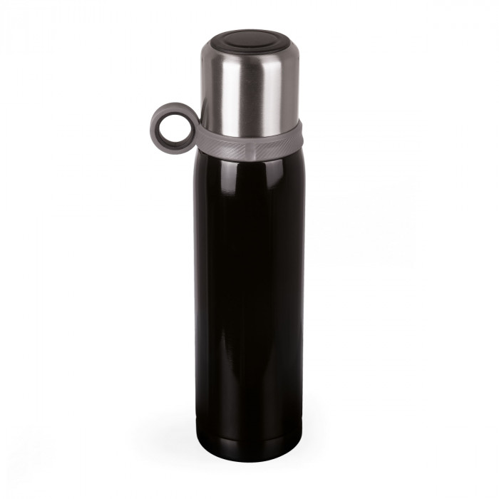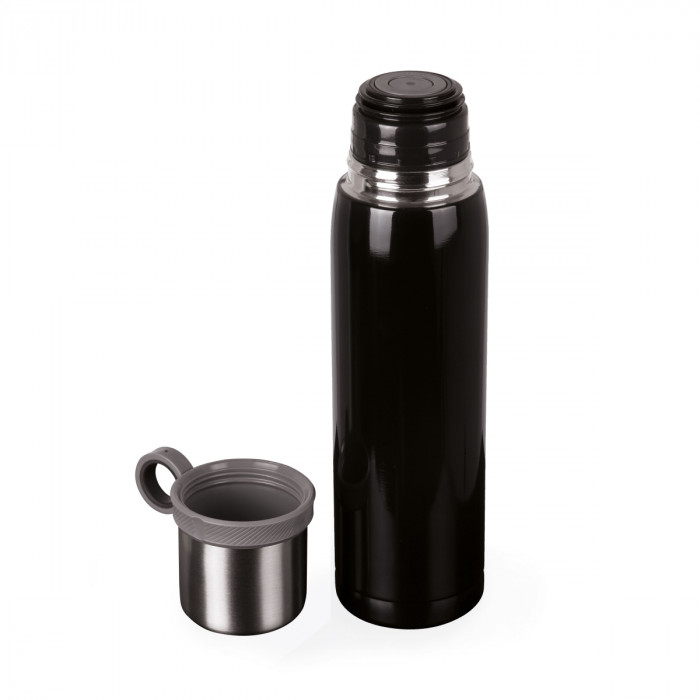 Термос з нержавіючої сталі, обєм 600 мл, кришка з герметичним клапаном. Корпус вкритий глянцевим кольоровим покриттям. Підтримує температуру до 24 годин. Упаковка індивідуальна чорна коробка та полієтиленовий пакет. Розмір термоса 28,5Х7,5 см.