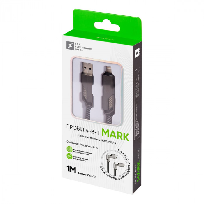 Универсальный кабель 3-в-1 для зарядки гаджетов, длина в растянутом состоянии 1,2 м. Имеет стандартный USB вход для подключения питания и три разных выхода Lightning + Mscro USB + Type-C. Материал: алюминий, нейлоновый плетеный шнур 1M, PD 60W , 20V/3A60W, 20V/3A(C-C)30W, 9V/3.4A(C-IP)18W, 5V/3.4A(USB-Type-C)15W, 9V/3.4A(USB-IP) Совместим с Macbook/ IP 15USB+Type-C - Type-C+IPX/12/13/14