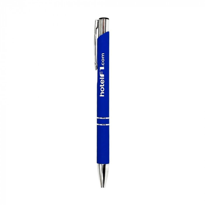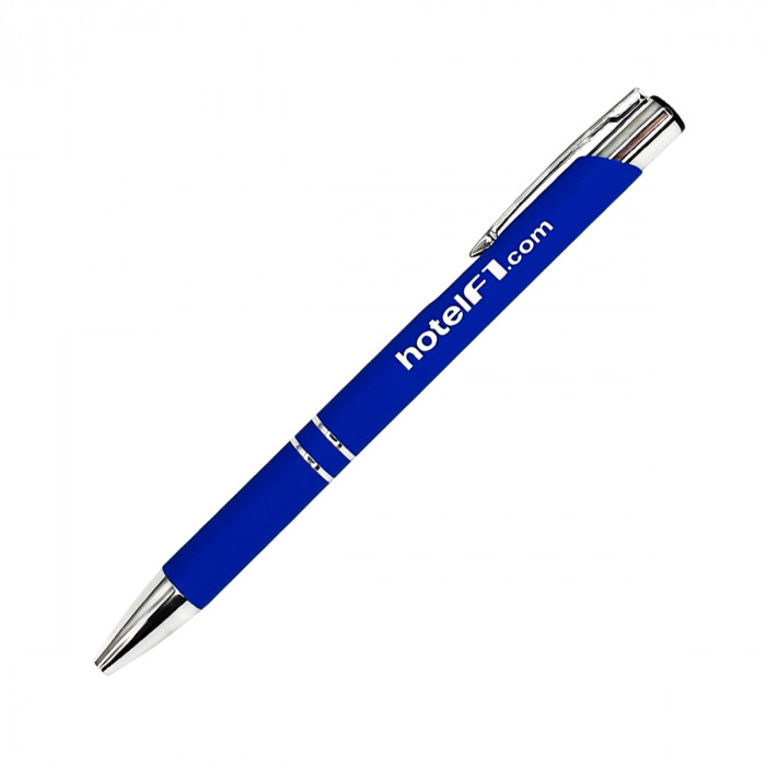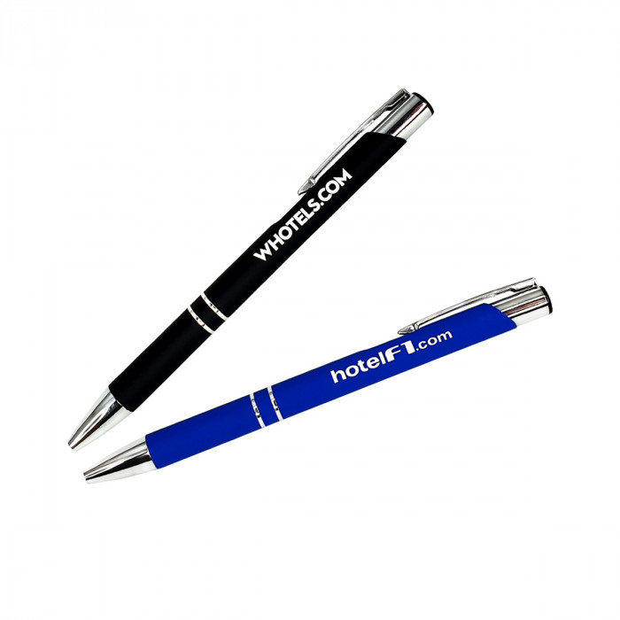 Металева ручка, кнопковий механізм, металевий хромований кліп-кнопка, 2 кільця в зоні захоплення, хромований носик, колір гравіювання - срібло. Розмір: 137 мм. Рекомендований розмір нанесення: 35 х 6 мм.