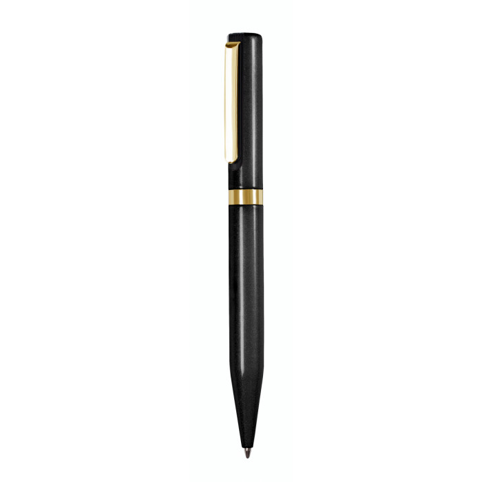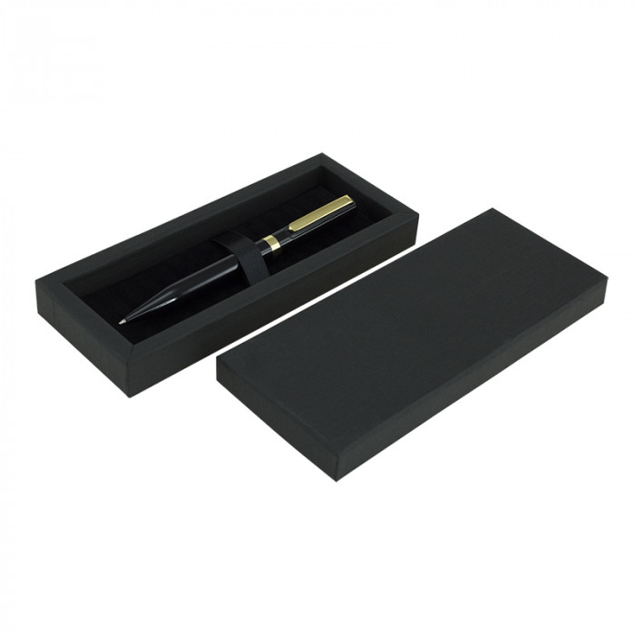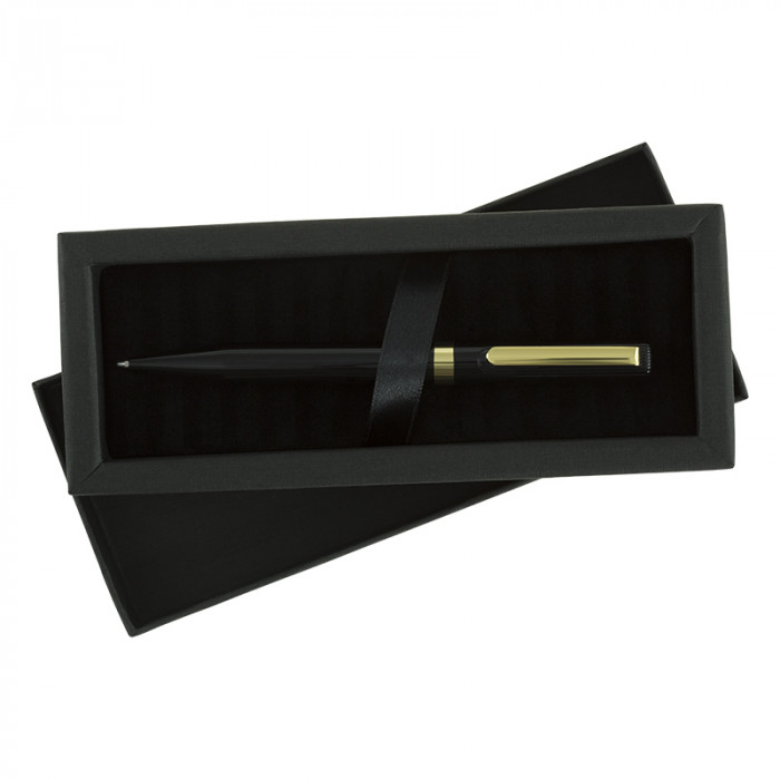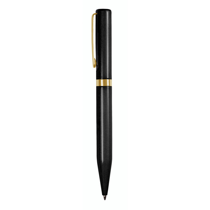 Металлическая шариковая ручка выполненная в классических цветах. Корпус покрыт глянцевой эмалью. Клип расположен на оригинальной рельефной вставке черного цвета. Клип и кольцо цвета золотой глянец. Поворотный механизм надежно предотвращает случайное нажатие в кармане. Подарочная коробка-футляр черного цвета.